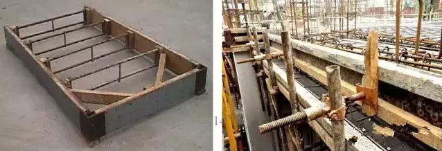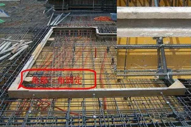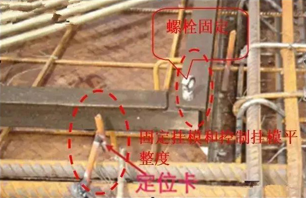 3.2對大于15cm的下沉式掛板,應(yīng)額外采取頂拉結(jié)合的定位加固措施,在模板底部焊接“十”字定位卡,角部拼縫處采用直三角加固。
