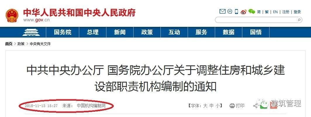 2018年11月13日,中國政府網(wǎng)發(fā)布《中共中央辦公廳 國務院辦公廳關于調(diào)整住房和城鄉(xiāng)建設部職責機構編制的通知》,通知提出:將公安部指導建設工程消防設計審查職責劃入住房和城鄉(xiāng)建設部,涉及消防部隊相關人員編制的劃轉待轉隸后另行核定。