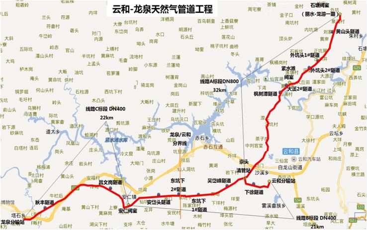 其中石塘清管站-嵩頭清管站段線路長度約31.3KM,管徑DN800,嵩頭清管站-龍泉分輸站段線路長度約37.68KM,管徑DN400,嵩頭清管站-云和分輸站段線路長度約5.07KM,管徑DN400。
