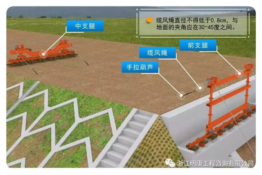 6、將前、中支腿橫移臺車置于橫移軌道上,找正中心距后,將前、中支腿與臺車連接,并用手拉葫蘆、纜風繩將支架部位與地面固定。