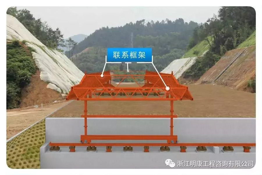 8、按安裝尺寸量好兩導梁的軌道中心距。安裝聯系框架,使左右桁架連成一體。