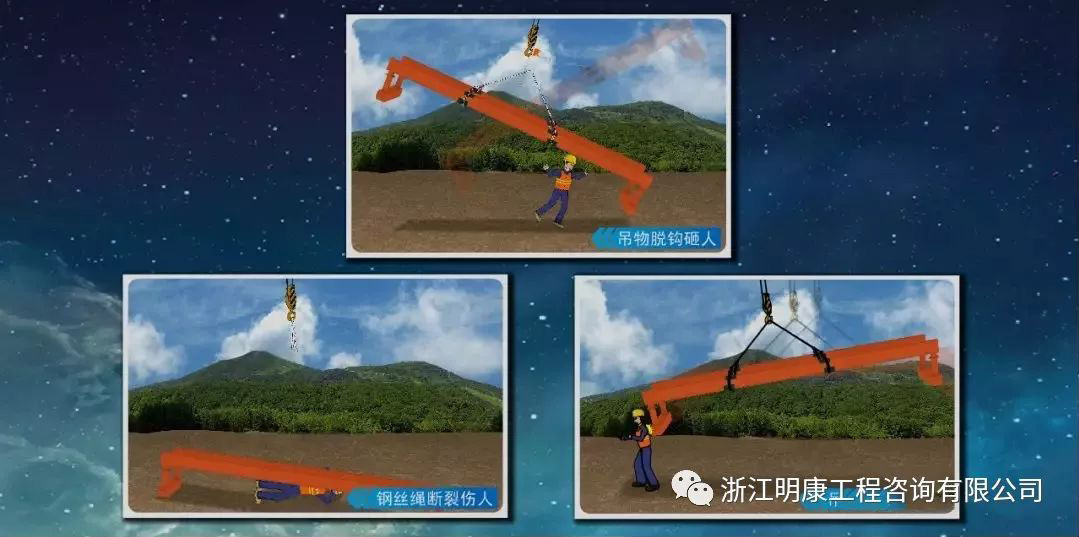 起重作業中,吊物脫鉤砸人、鋼絲繩斷裂傷人、吊物移動時撞人等。