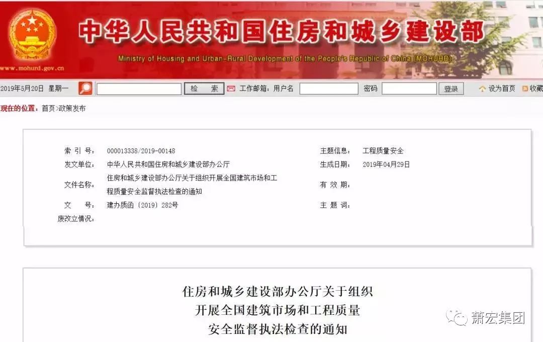 2019年5月20日住建部官網發布《關于組織開展全國建筑市場和工程質量安全監督執法檢查的通知》,決定在全國統籌開展建筑市場和工程質量安全監督執法檢查: