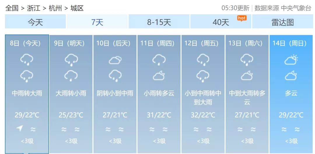 未來3-5天浙中北地區又將有持續性強降雨過程,氣溫也將被打壓。從氣象臺發布的最新消息顯示,杭州今天夜里到明天,強降水來勢洶洶,淳安、建德、桐廬雨量較大,有暴雨、局部大暴雨,北部各區有大雨到暴雨。