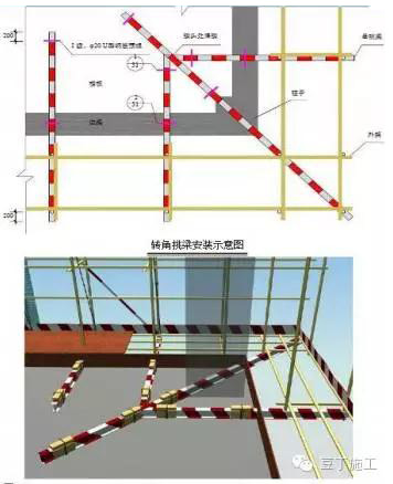 2)角部懸挑部分應(yīng)設(shè)置鋼絲繩兩道。