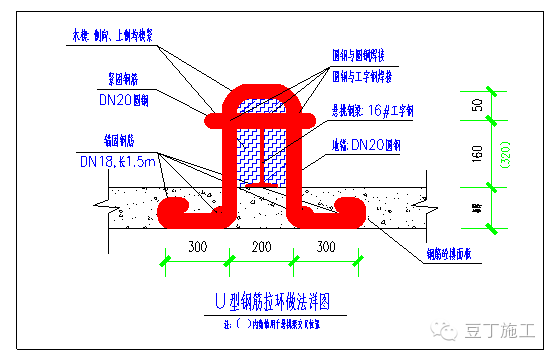 根據(jù)相關(guān)規(guī)范及我司的經(jīng)驗(yàn),在懸挑梁上設(shè)置立桿固定腳,采用DN25鋼筋頭與鋼梁滿焊。