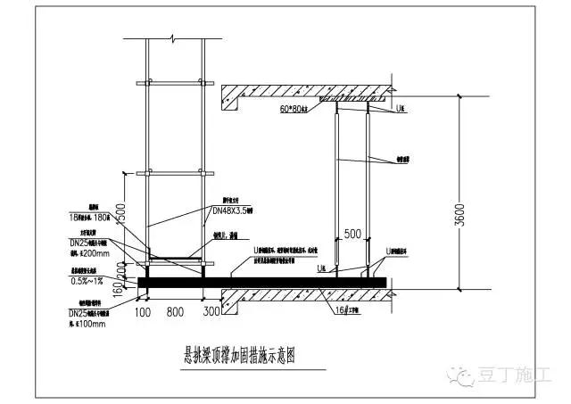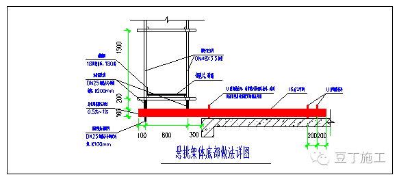 1)立桿直接立在懸挑梁上,外端立桿距懸挑梁端不應(yīng)小于100mm,挑梁懸挑端焊接200mm高直徑25mm的鋼筋,用于固定鋼管,防止方管的滑動(dòng)。