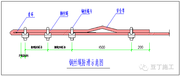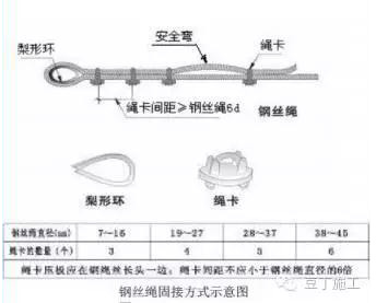 鋼絲繩的受力卡扣應(yīng)等距布設(shè)3個(gè)或以上,間距鋼絲繩直徑6倍,第4個(gè)卡扣為保險(xiǎn)卡扣。鋼絲繩卡扣螺絲應(yīng)全部擰緊,不允許松動(dòng),繩的末端應(yīng)形成一個(gè)安全彎,以檢視繩受力時(shí)有無末端滑移的現(xiàn)象。其大樣圖如下圖所示。