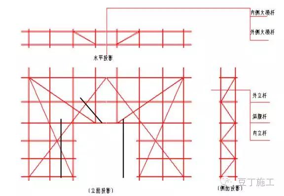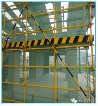 1)腳手架必須設(shè)置支撐體系。支撐體系包括縱向支撐(剪刀撐)、橫向支撐,這些支撐應(yīng)和腳手架這一空間構(gòu)架的基本構(gòu)件很好聯(lián)結(jié)。