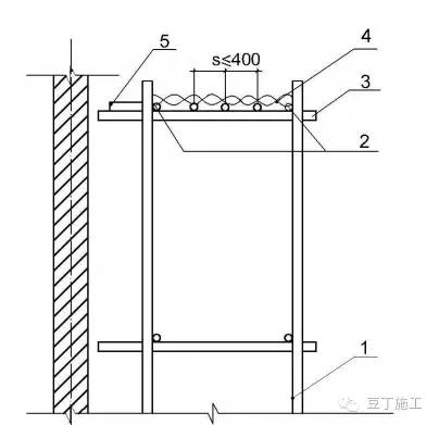 4)施工過程中當(dāng)個(gè)別連墻桿被拆除后在相當(dāng)一段時(shí)期內(nèi)難于補(bǔ)上時(shí),應(yīng)采取在附近添設(shè)一個(gè)臨時(shí)的連墻桿,限制施工荷載或加強(qiáng)橫向剛度等。