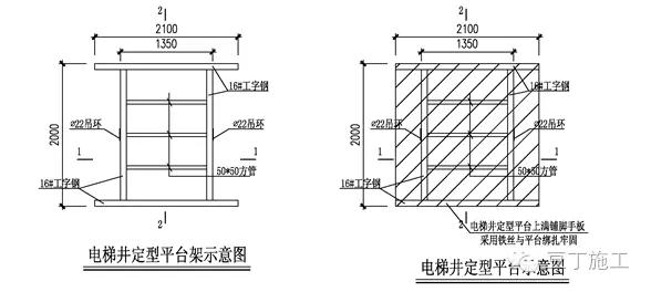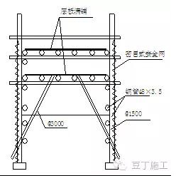 井道內(nèi)架體采用型鋼鋼管腳手架架體,腳手架每層與周邊剪力墻剛性連接,從底部至頂部連續(xù)設(shè)置剪刀撐。